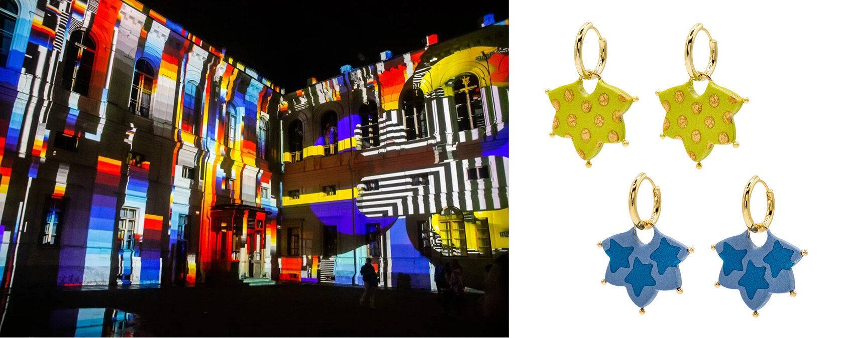 Серьги Короны-кокошники бренда Aromanta созданы по тому же принципу: в миниатюрных подвесках ручной работы соединяются яркие цвета и чёткие формы. И на фасаде Гатчинского дворца, и в этих украшениях простота становится основой выразительного и цельного образа.